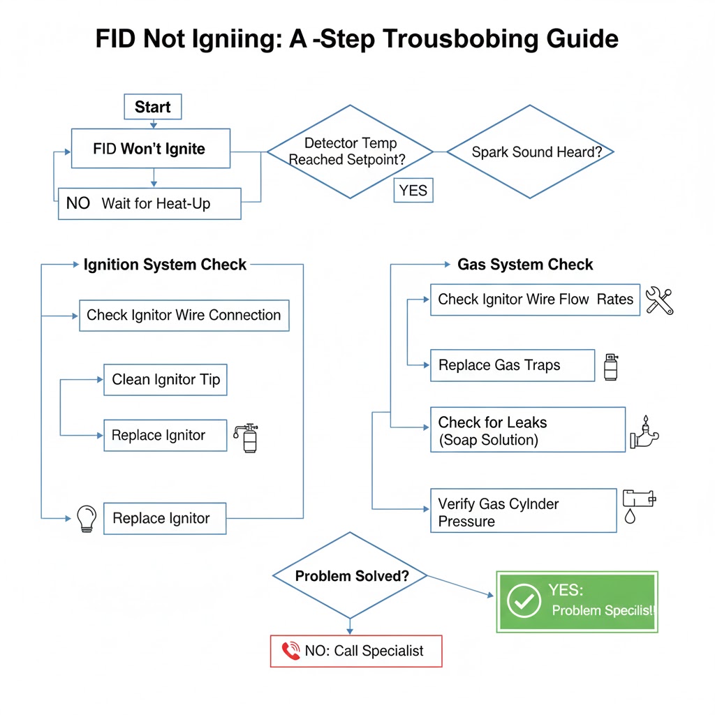 - آیا دمای دتکتور به حداقل لازم رسیده است؟ اکثر دستگاهها تا رسیدن دمای FID به حداقل تنظیم شده (معمولا بالای ۱۵۰ درجه سانتیگراد) اجازه جرقه نمیدهند. صبر کنید تا دما به set point برسد.