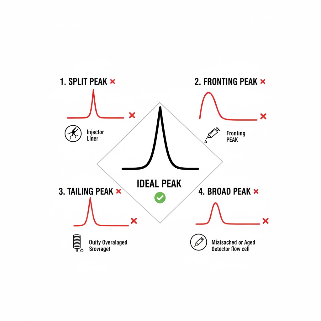 - نشتی (Leak): یک نشتی کوچک، به ویژه در ناحیه اینجکتور، میتواند الگوی جریان را به هم زده و باعث بدشکلی پیک شود. همیشه تست نشتی را انجام دهید.